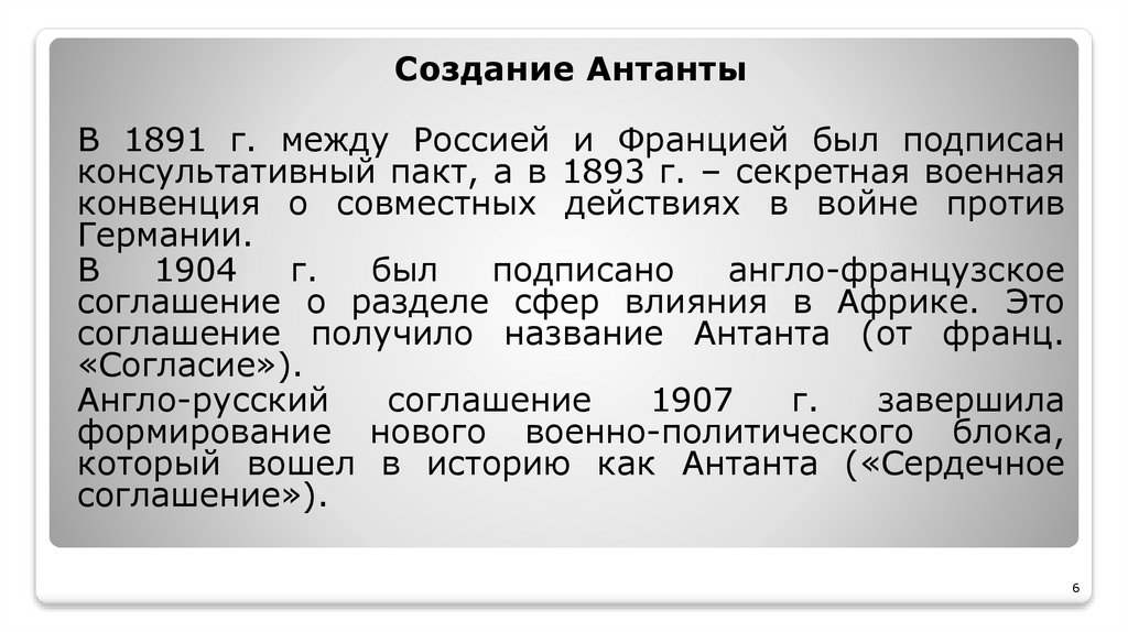 Создание АнтантыВ 1891 г. между Россией и Францией был подписан