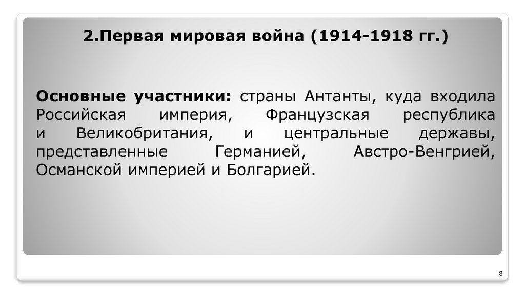 2.Первая мировая война (1914-1918 гг.)Основные участники: страны Антанты, куда входила