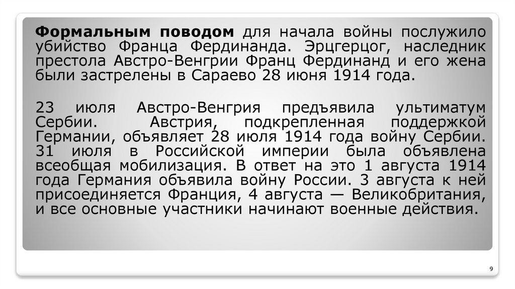 Формальным поводом для начала войны послужилоубийство Франца Фердинанда. Эрцгерцог, наследник
