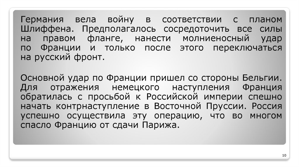 Германия вела войну в соответствии с планомШлиффена. Предполагалось сосредоточить все силы