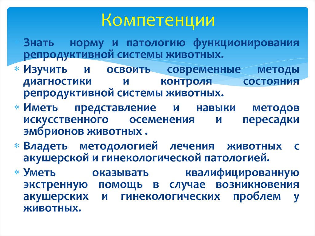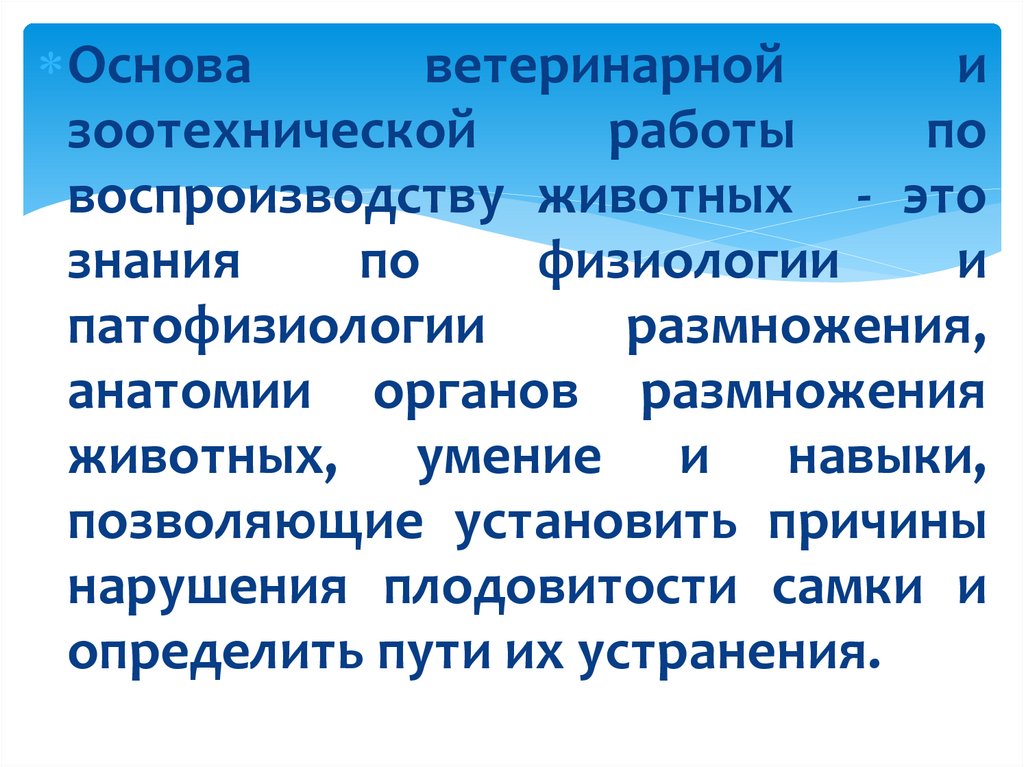 Знать норму и патологию функционированиярепродуктивной системы животных.