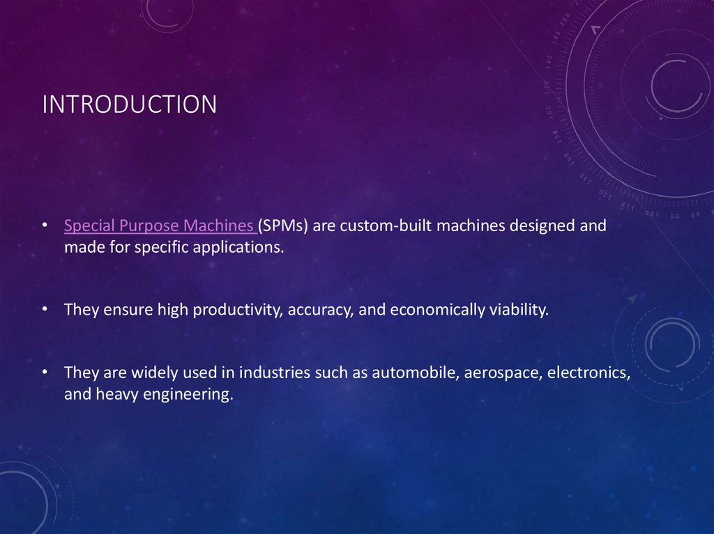 INTRODUCTION• Special Purpose Machines (SPMs) are custom-built machines designed and