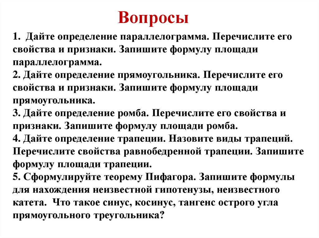 Вопросы1. Дайте определение параллелограмма. Перечислите его