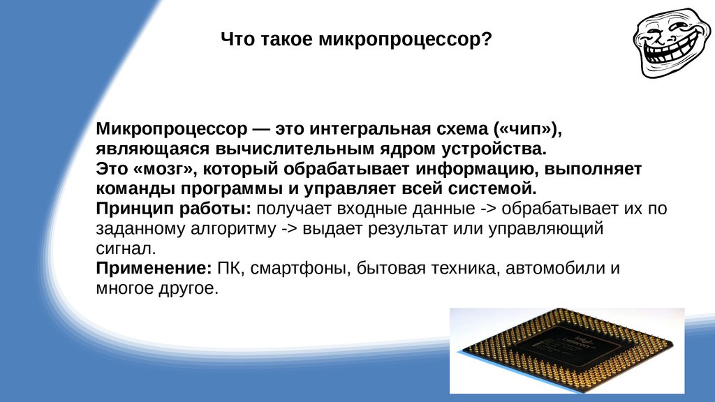 Что такое микропроцессор?Микропроцессор — это интегральная схема («чип»),