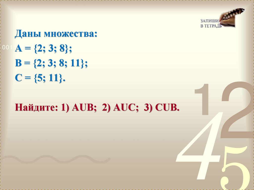 Найдите: 1) АUВ; 2) АUС; 3) СUВ.