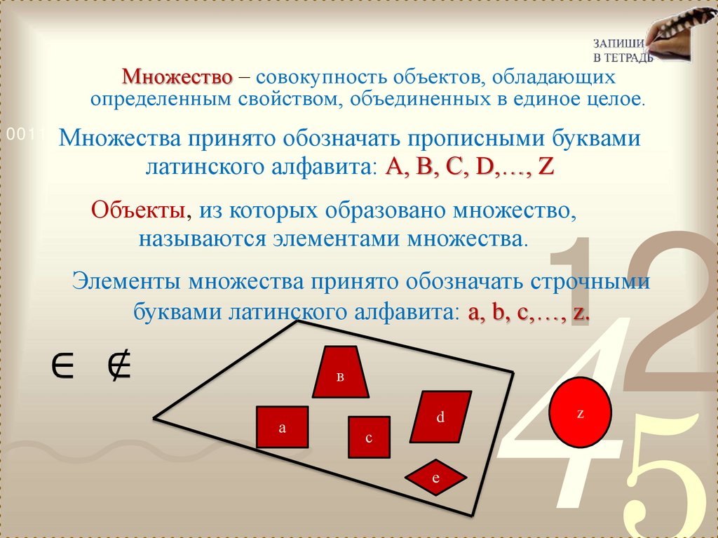 Множество – совокупность объектов, обладающихопределенным свойством, объединенных в единое целое.