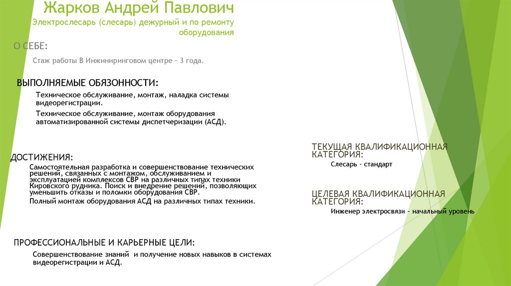 1. Жарков Андрей Павлович Электрослесарь (слесарь) дежурный и по ремонту оборудования