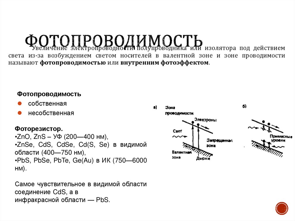 Увеличение электропроводности полупроводника или изолятора под действиемсвета из-за возбуждением светом носителей в валентной зоне и зоне проводимости