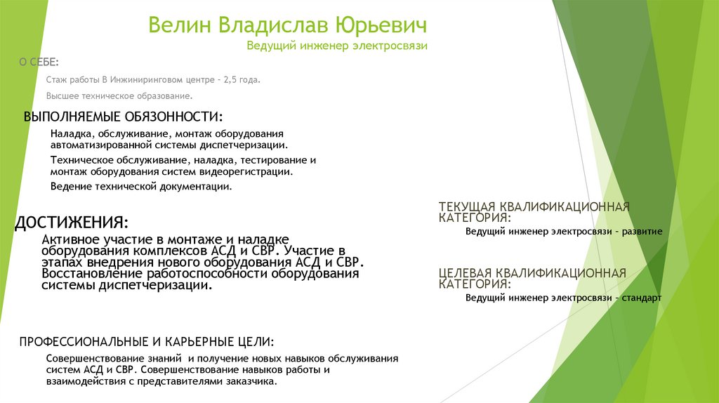 1. Велин Владислав Юрьевич Ведущий инженер электросвязи