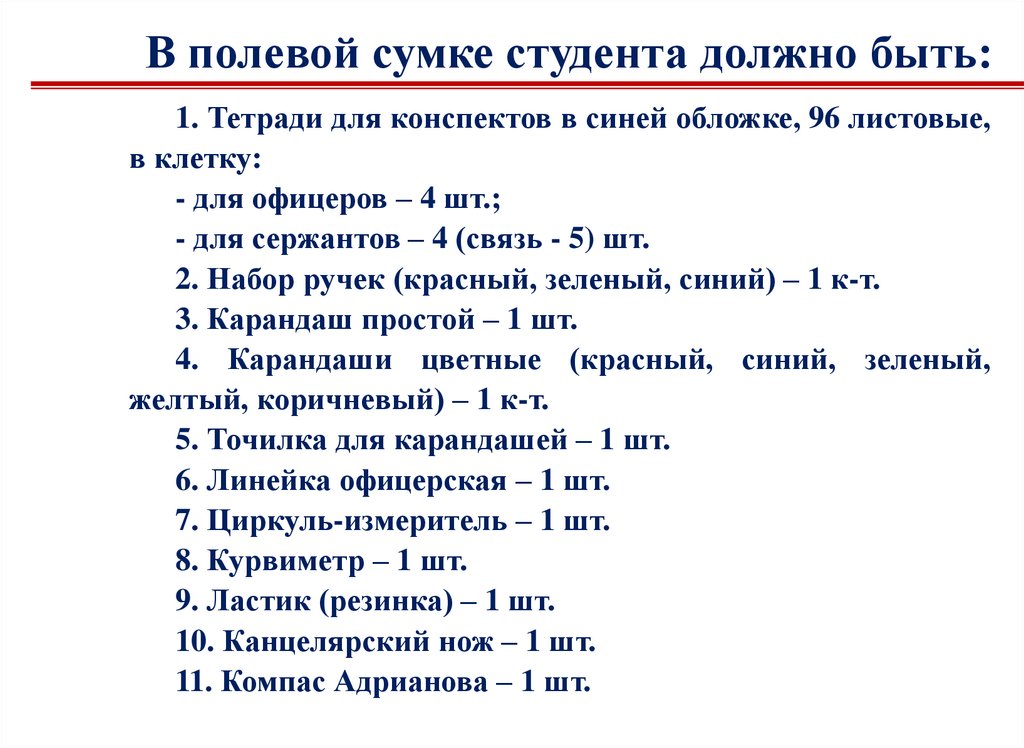 В полевой сумке студента должно быть:1. Тетради для конспектов в синей обложке, 96 листовые,