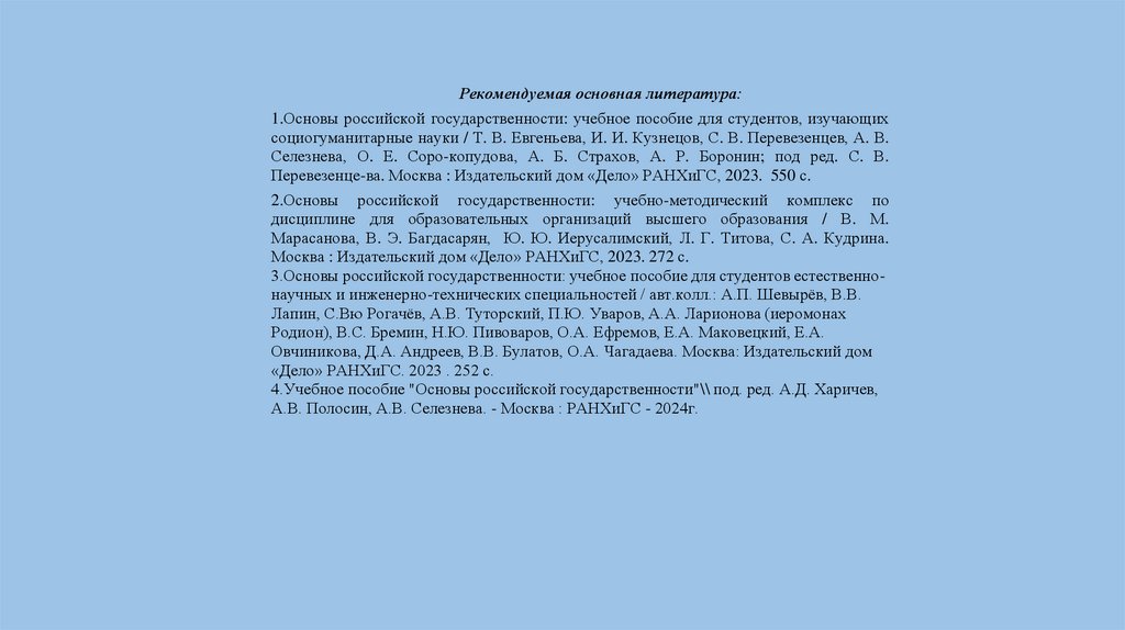 Рекомендуемая основная литература:1.Основы российской государственности: учебное пособие для студентов, изучающих