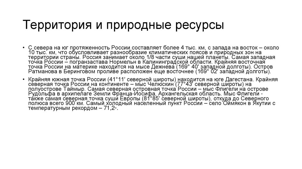 Территория и природные ресурсы• С севера на юг протяженность России составляет более 4 тыс. км, с запада на восток – около