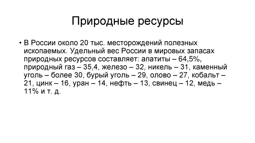 Природные ресурсы• В России около 20 тыс. месторождений полезных