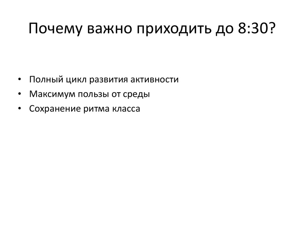 Почему важно приходить до 8:30?• Полный цикл развития активности