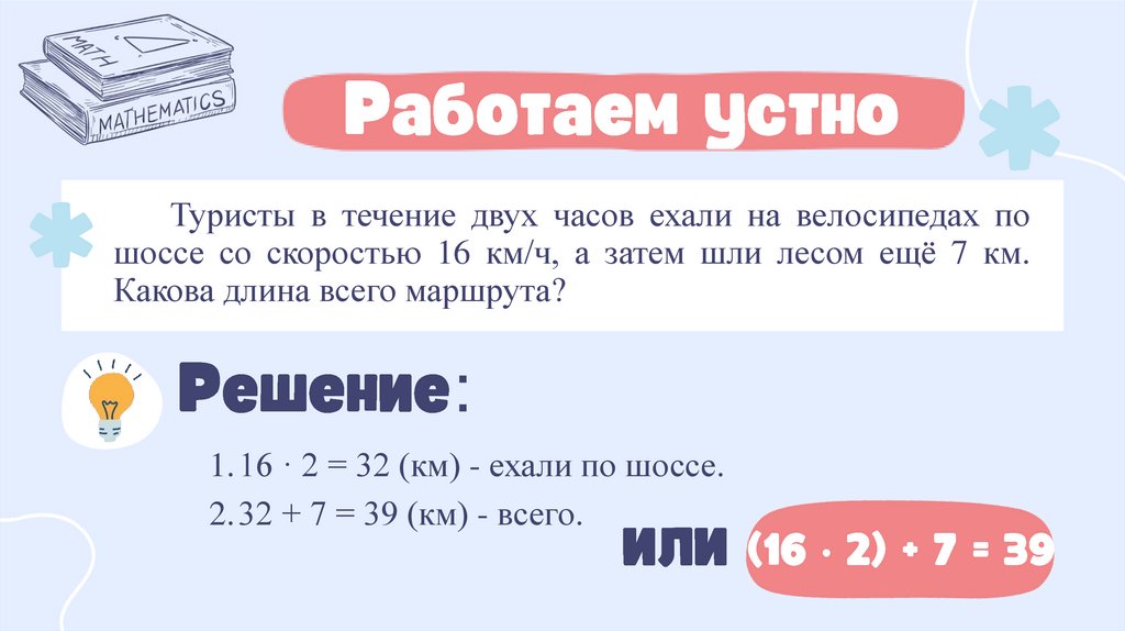 Туристы в течение двух часов ехали на велосипедах пошоссе со скоростью 16 км/ч, а затем шли лесом ещё 7 км.