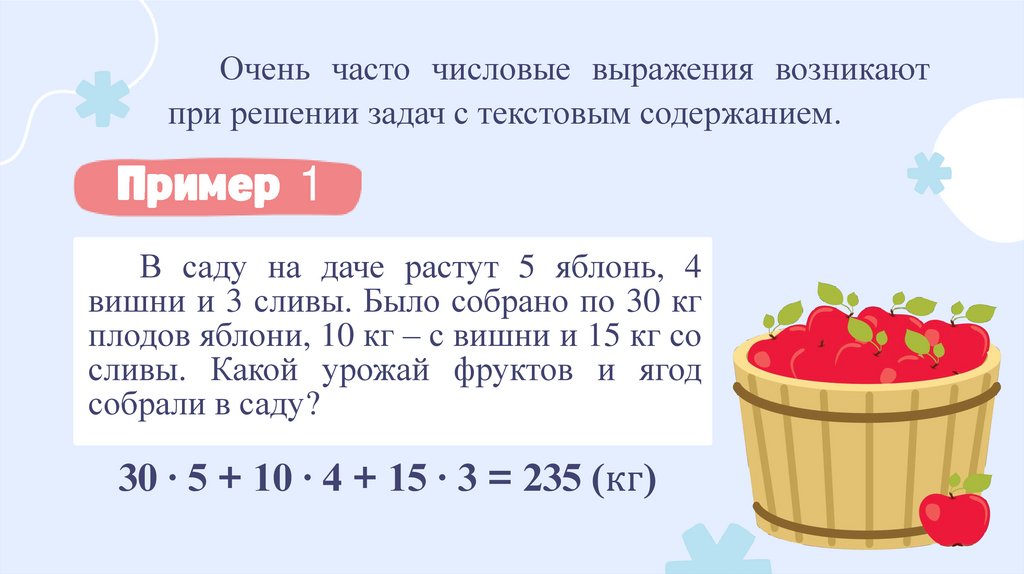 Очень часто числовые выражения возникаютпри решении задач с текстовым содержанием.