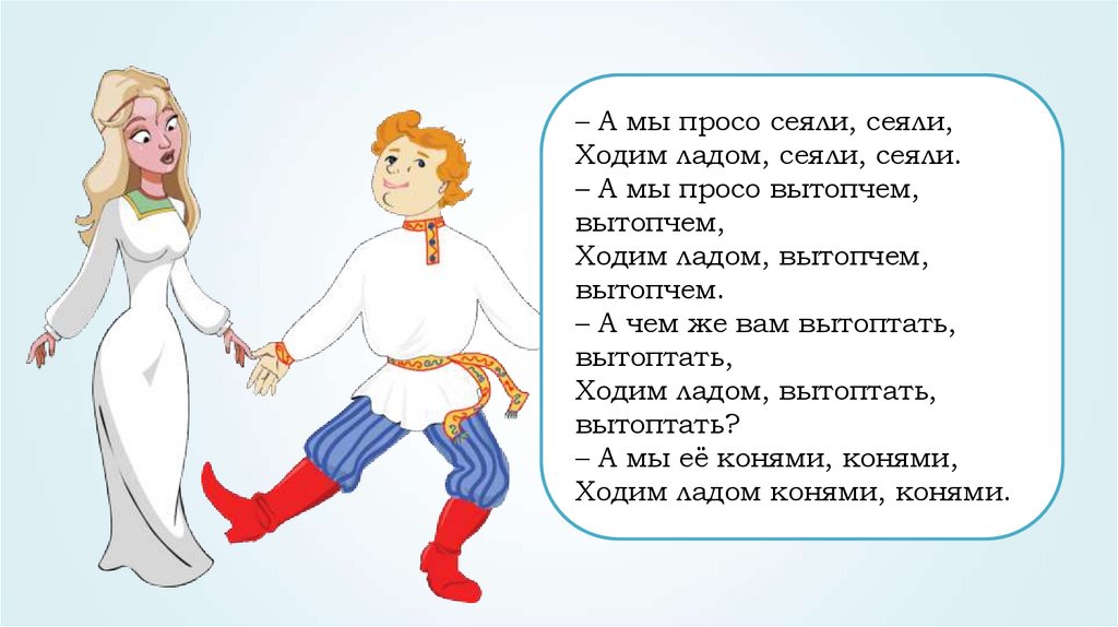 – А мы просо сеяли, сеяли,Ходим ладом, сеяли, сеяли.