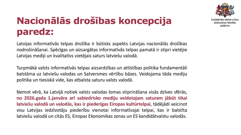 saturu valsts valodā no 2026.gada 1.janvāra, kā arī satura nodrošināšana