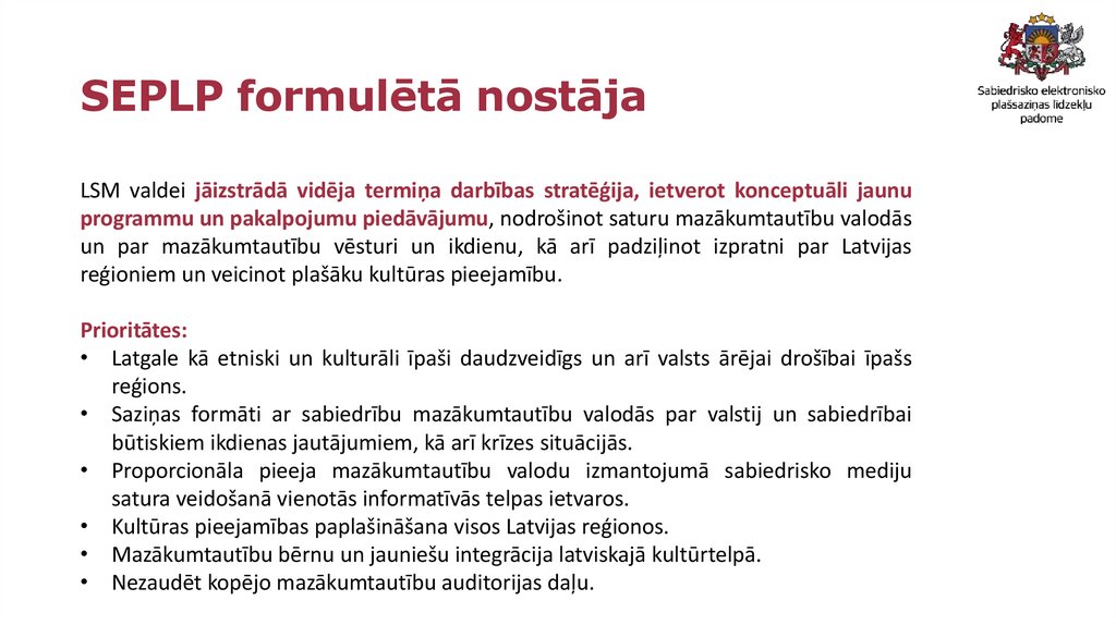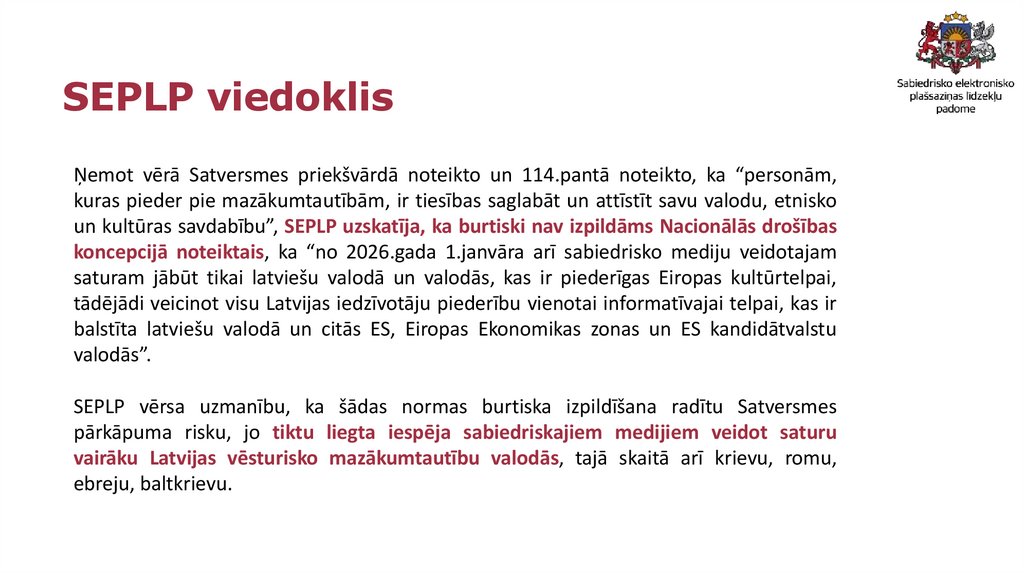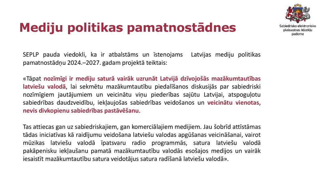Mediju politikas pamatnostādnesSEPLP pauda viedokli, ka ir atbalstāms un īstenojams