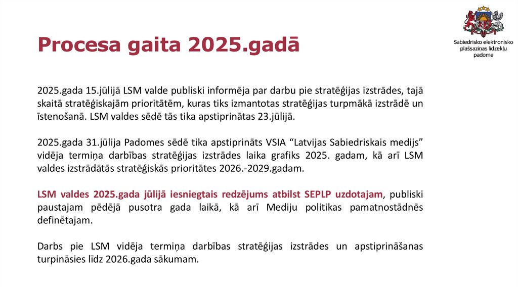Procesa gaita 2025.gadā2025.gada 15.jūlijā LSM valde publiski informēja par darbu pie stratēģijas izstrādes, tajā