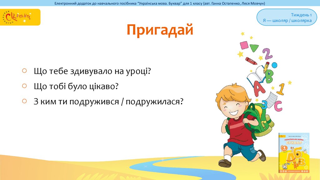 Електронний додаток до навчального посібника “Українська мова. Буквар” для 1 класу (авт. Ганна Остапенко, Леся Мовчун)Пригадай