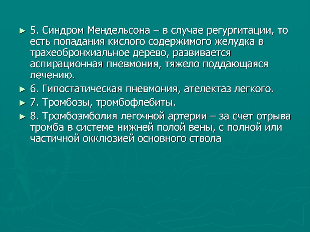 ► 5. Синдром Мендельсона – в случае регургитации, тоесть попадания кислого содержимого желудка в