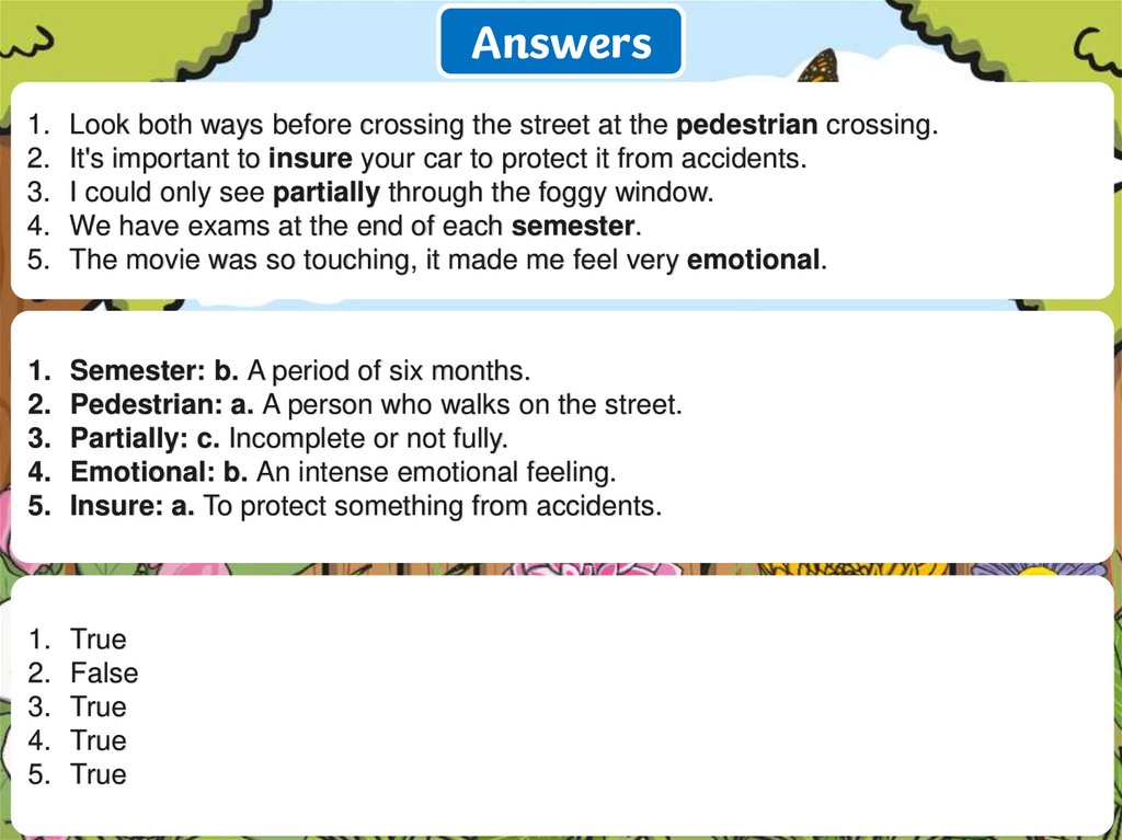 Answers1. Look both ways before crossing the street at the pedestrian crossing.