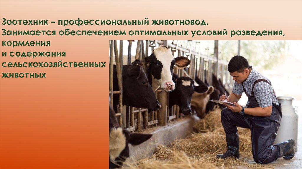 Зоотехник – профессиональный животновод.Занимается обеспечением оптимальных условий разведения,
