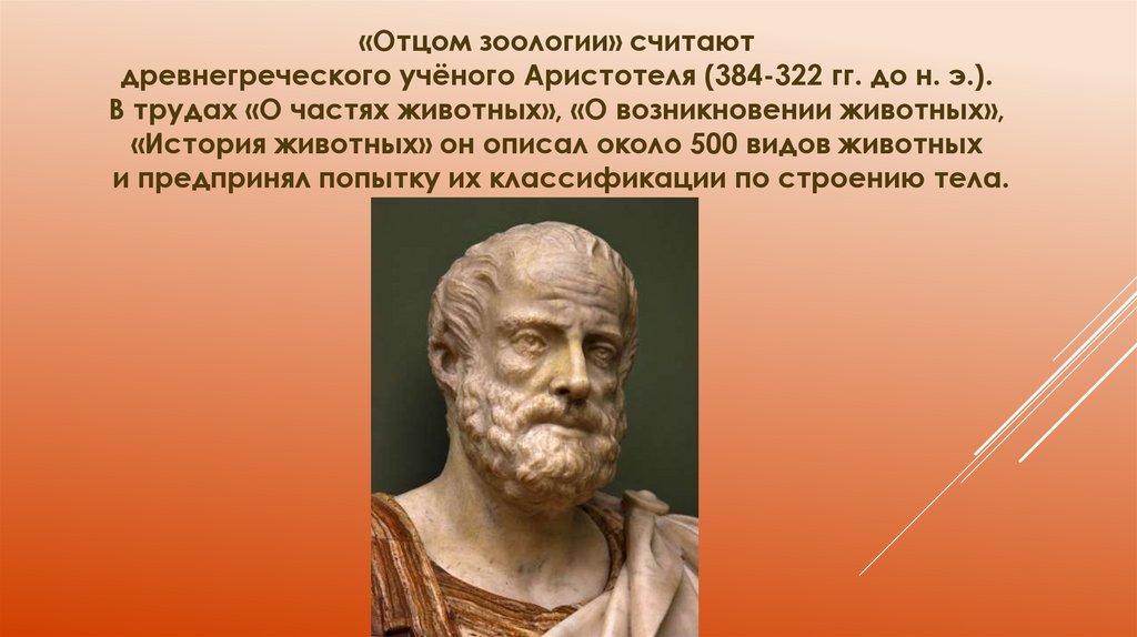 «Отцом зоологии» считаютдревнегреческого учёного Аристотеля (384-322 гг. до н. э.).