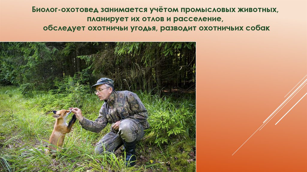 Биолог-охотовед занимается учётом промысловых животных,планирует их отлов и расселение,