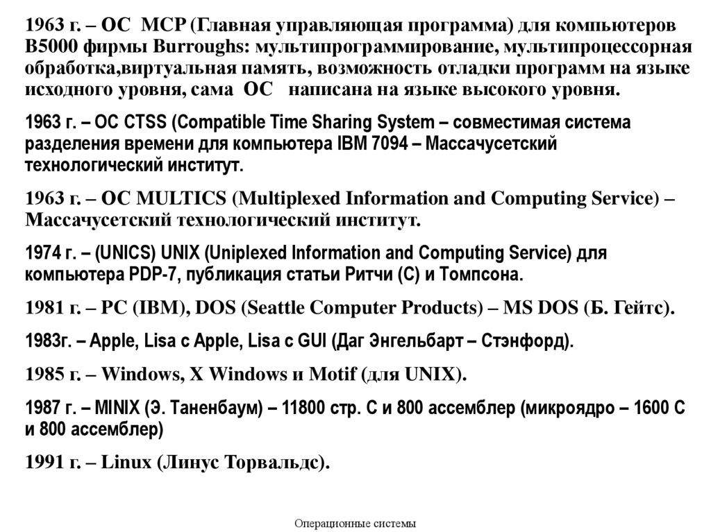 1963 г. – ОС MCP (Главная управляющая программа) для компьютеровB5000 фирмы Burroughs: мультипрограммирование, мультипроцессорная