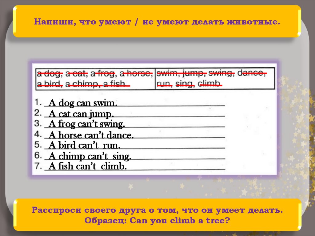 Напиши, что умеют / не умеют делать животные.A dog can swim.