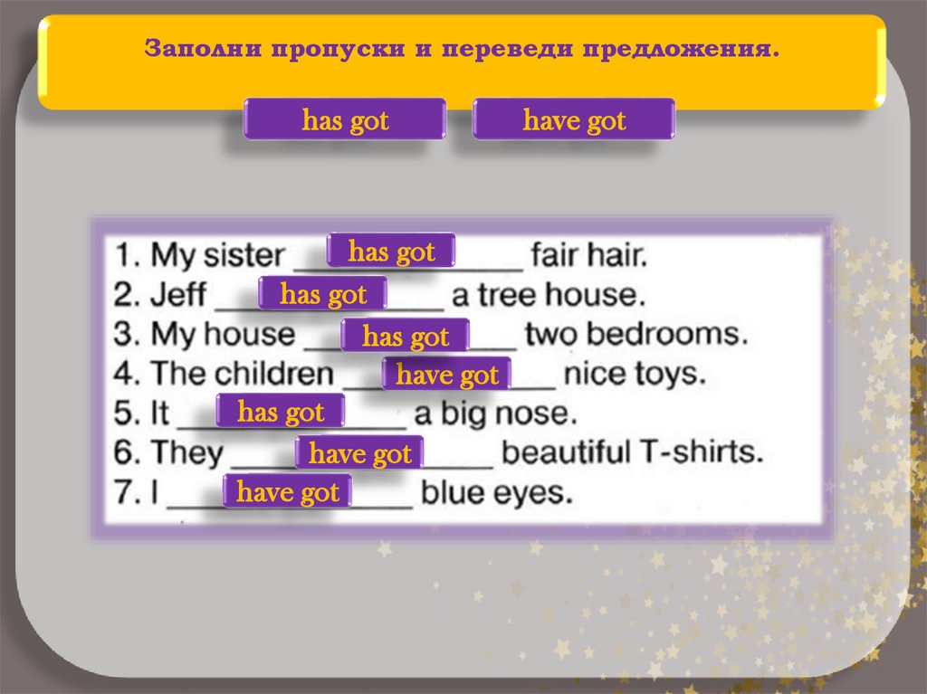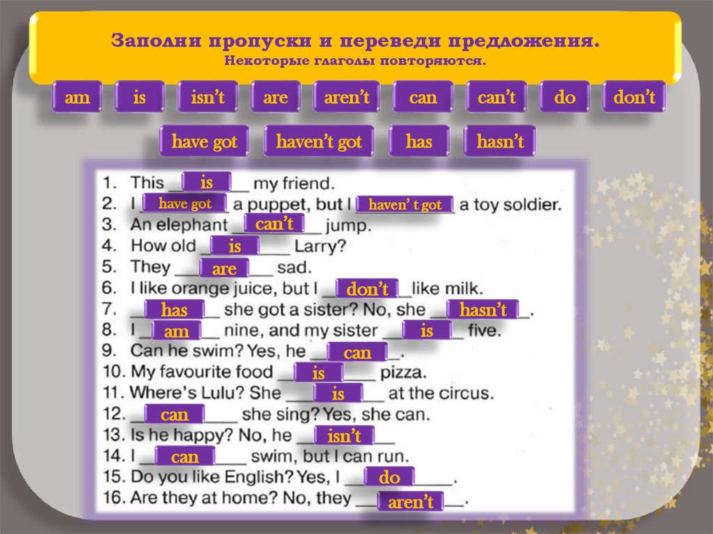 Заполни пропуски и переведи предложения.Некоторые глаголы повторяются.