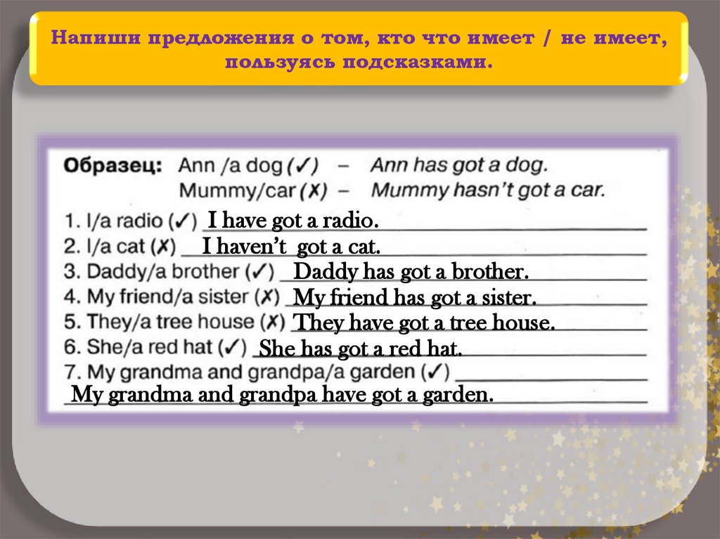 Напиши предложения о том, кто что имеет / не имеет,пользуясь подсказками.