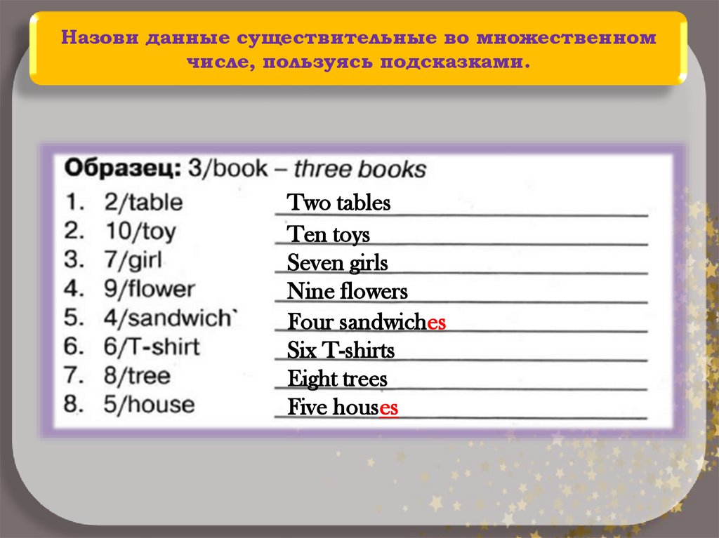 Назови данные существительные во множественномчисле, пользуясь подсказками.