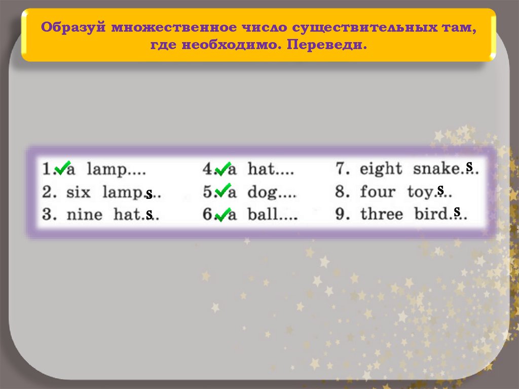 Образуй множественное число существительных там,где необходимо. Переведи.