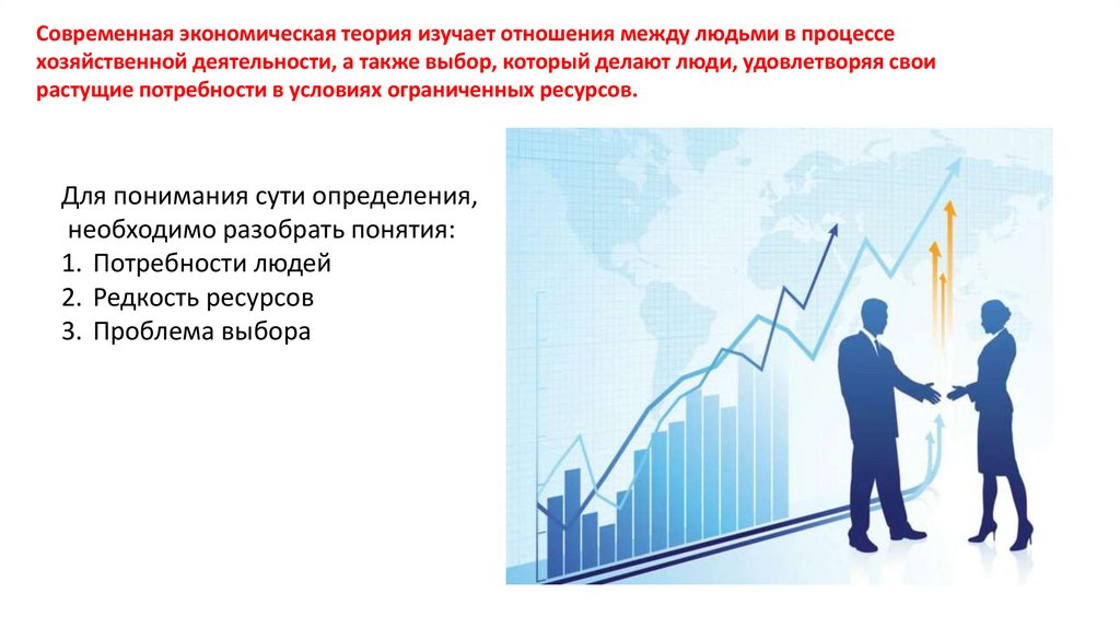 Современная экономическая теория изучает отношения между людьми в процессехозяйственной деятельности, а также выбор, который делают люди, удовлетворяя свои