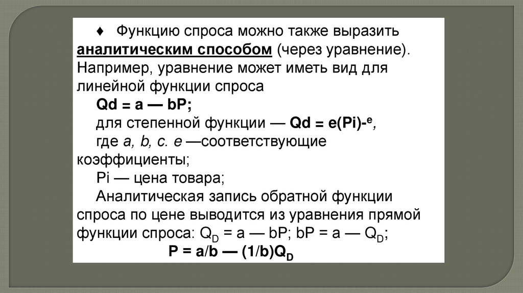 ♦ Функцию спроса можно также выразитьаналитическим способом (через уравнение).