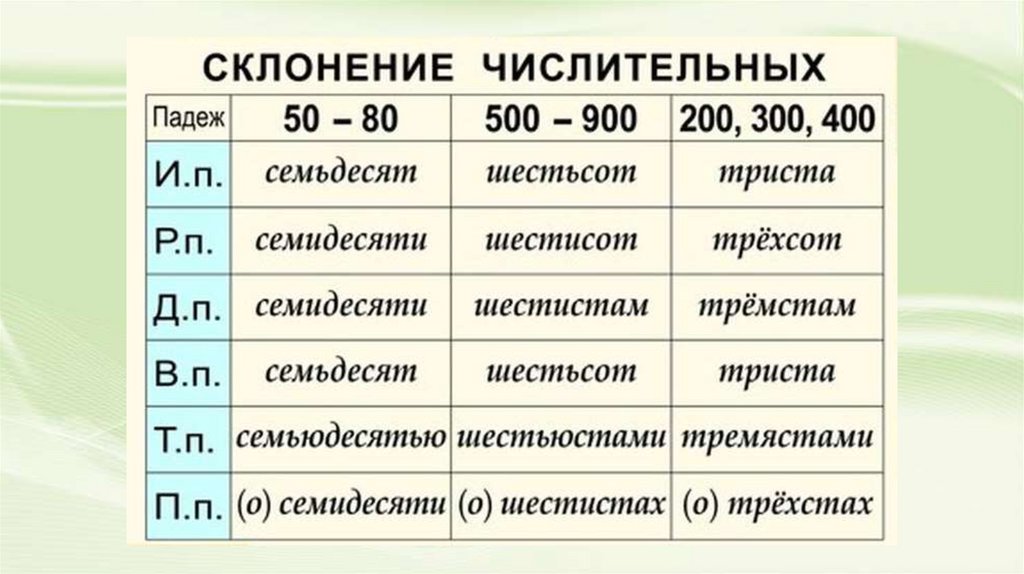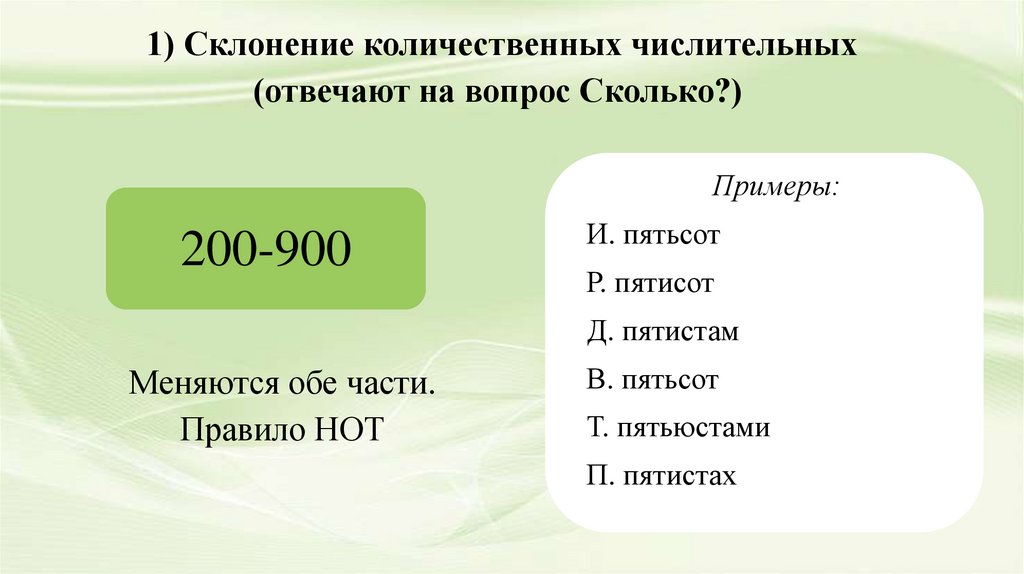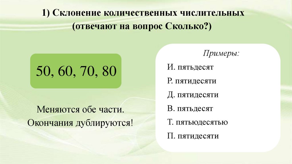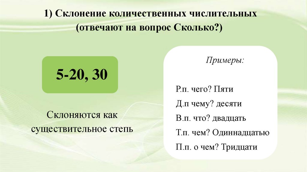1) Склонение количественных числительных(отвечают на вопрос Сколько?)