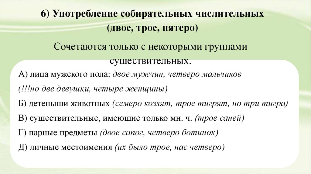 6) Употребление собирательных числительных(двое, трое, пятеро)