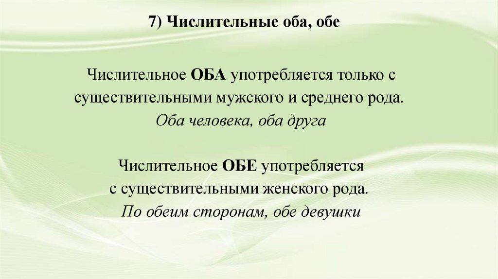 7) Числительные оба, обеЧислительное ОБА употребляется только с