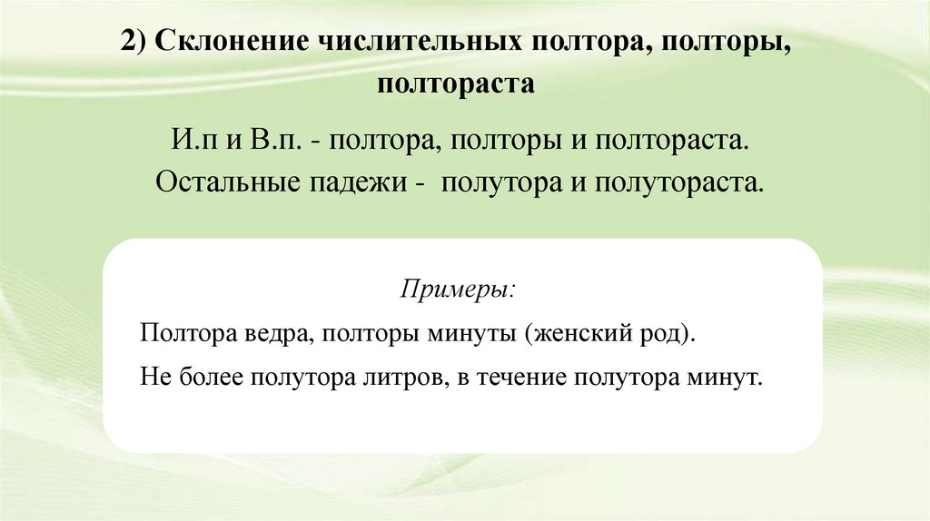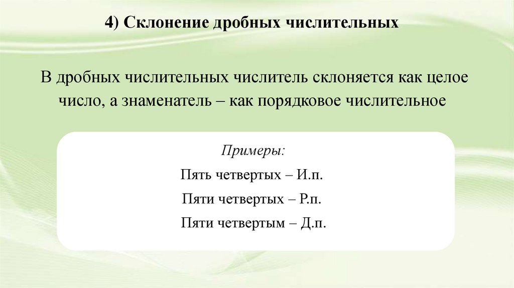 4) Склонение дробных числительныхВ дробных числительных числитель склоняется как целое