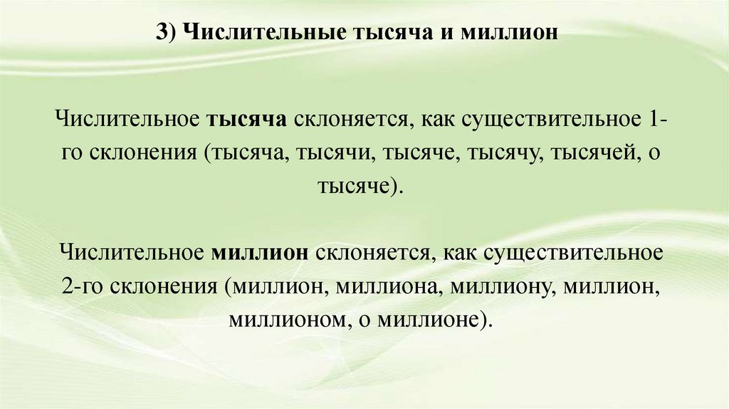 3) Числительные тысяча и миллионЧислительное тысяча склоняется, как существительное 1го склонения (тысяча, тысячи, тысяче, тысячу, тысячей, о