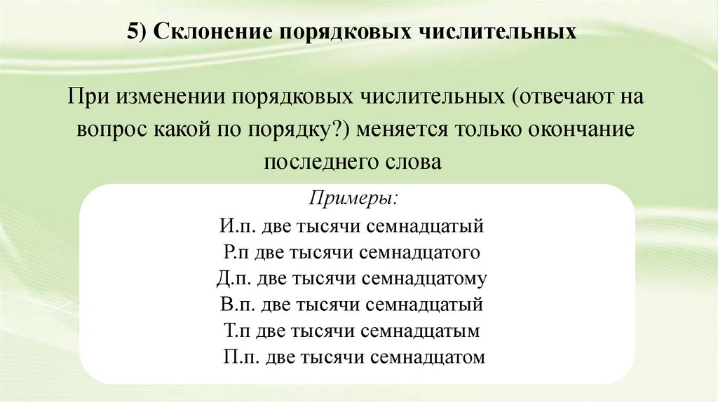 5) Склонение порядковых числительныхПри изменении порядковых числительных (отвечают на