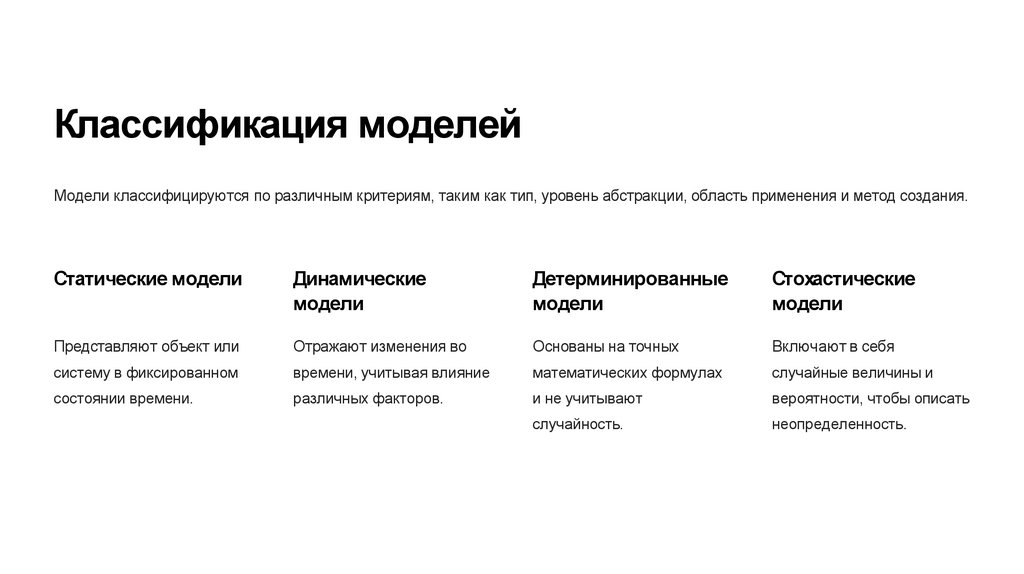 Классификация моделейМодели классифицируются по различным критериям, таким как тип, уровень абстракции, область применения и метод создания.