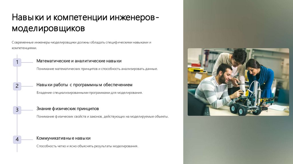 Навы ки и компетенции инженеровмоделировщиковСовременные инженеры-моделировщики должны обладать специф ическими навыками и