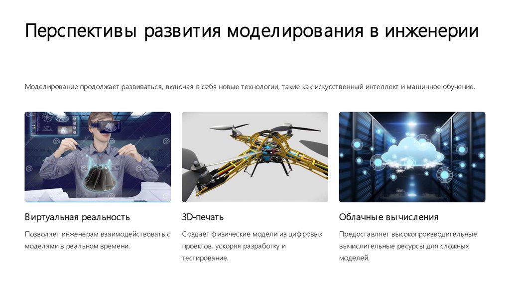 Перспективы развития моделирования в инженерииМоделирование продолжает развиваться, включая в себя новые технологии, такие как искусственный интеллект и машинное обучение.