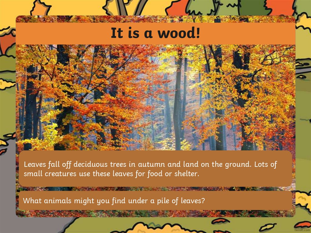 It is a wood!Leaves fall off deciduous trees in autumn and land on the ground. Lots of