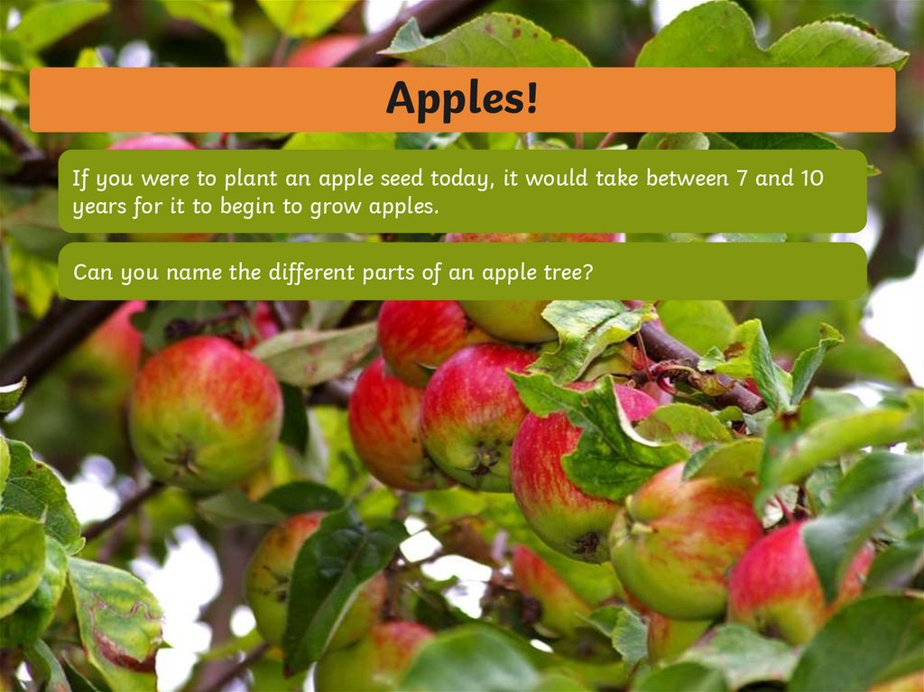 Apples!If you were to plant an apple seed today, it would take between 7 and 10