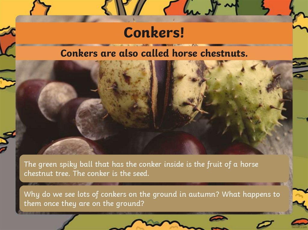 Conkers!Conkers are also called horse chestnuts.